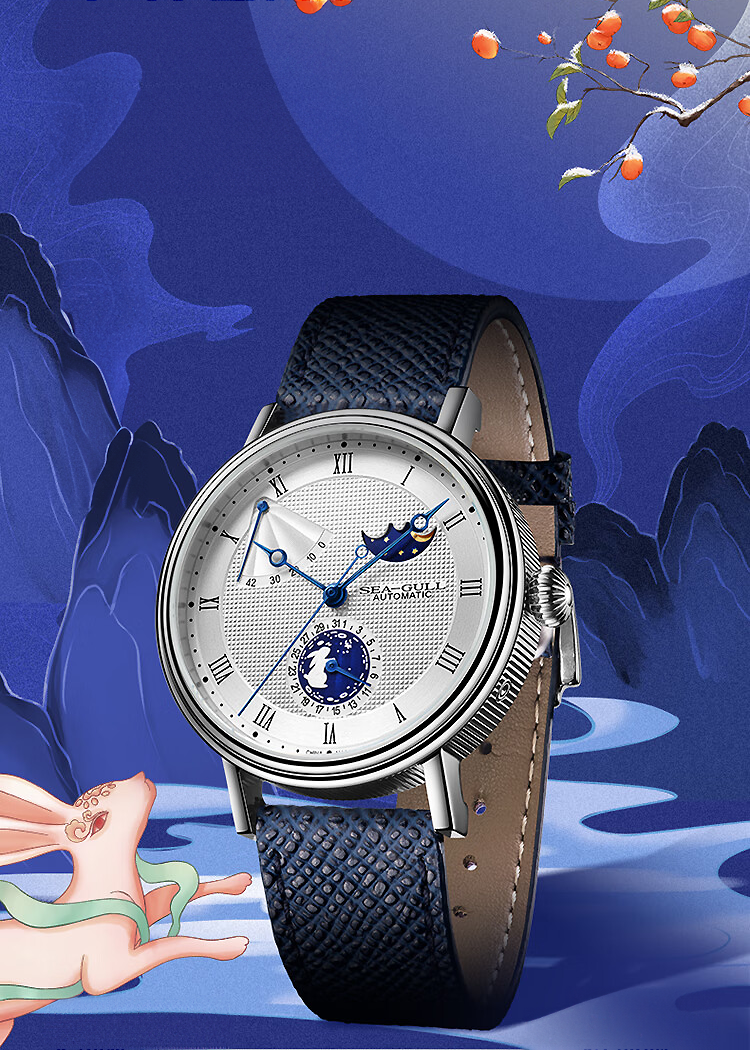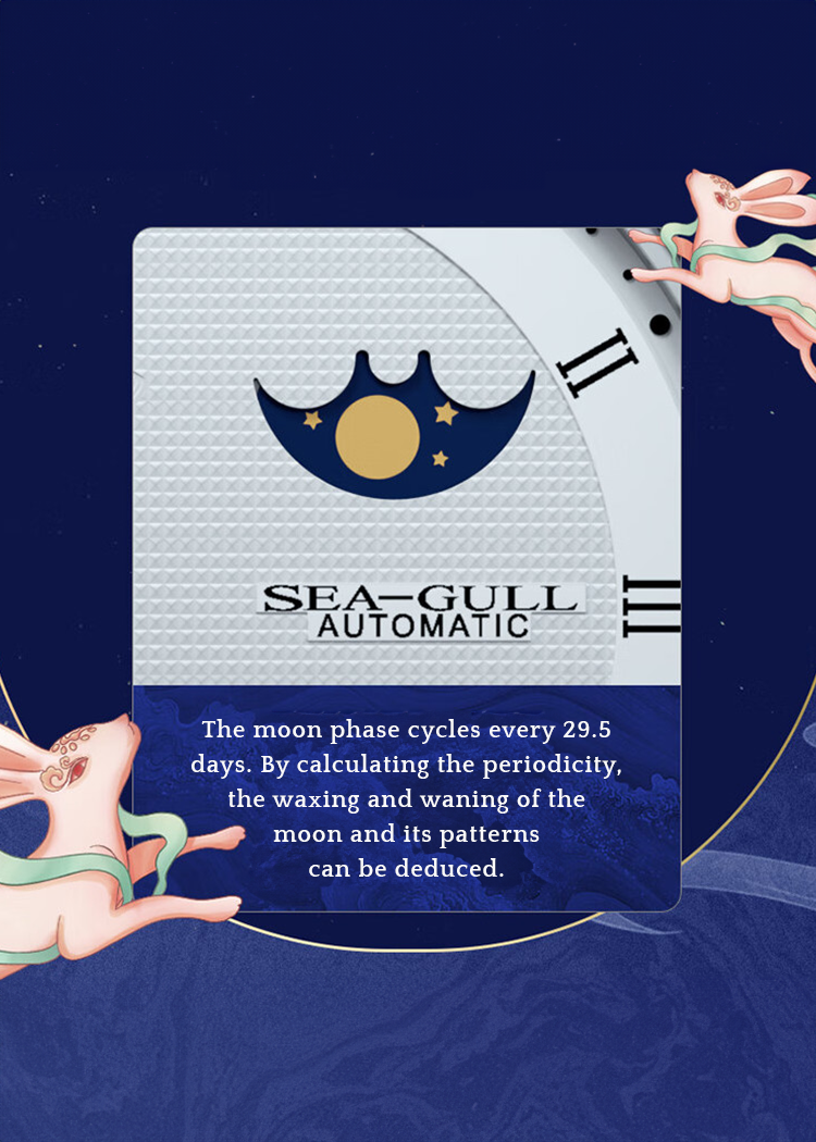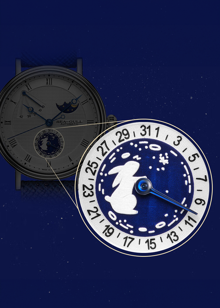 Intégrant le motif du lapin aux phases de lune changeantes, en vélo sans fin, comme pour suivre le rythme du temps. Baigné de clair de lune, embrassant l’espoir et poursuivant ses rêves. L'affichage de la réserve de marche indique clairement l'énergie restante dans la montre, comme la jauge de carburant d'une voiture, la gardant sous contrôle et évitant tout arrêt. La date à aiguille indique le calendrier, la jolie forme de lapin de jade regarde vers le haut, conférant une vitalité renouvelée au petit cadran, en collision avec les nouvelles tendances de la culture pop. Le bracelet en cuir grainé lézard est souple et respirant. L'acier inoxydable 316L offre une résistance robuste à la corrosion, avec un éclat encore plus élevé après polissage.