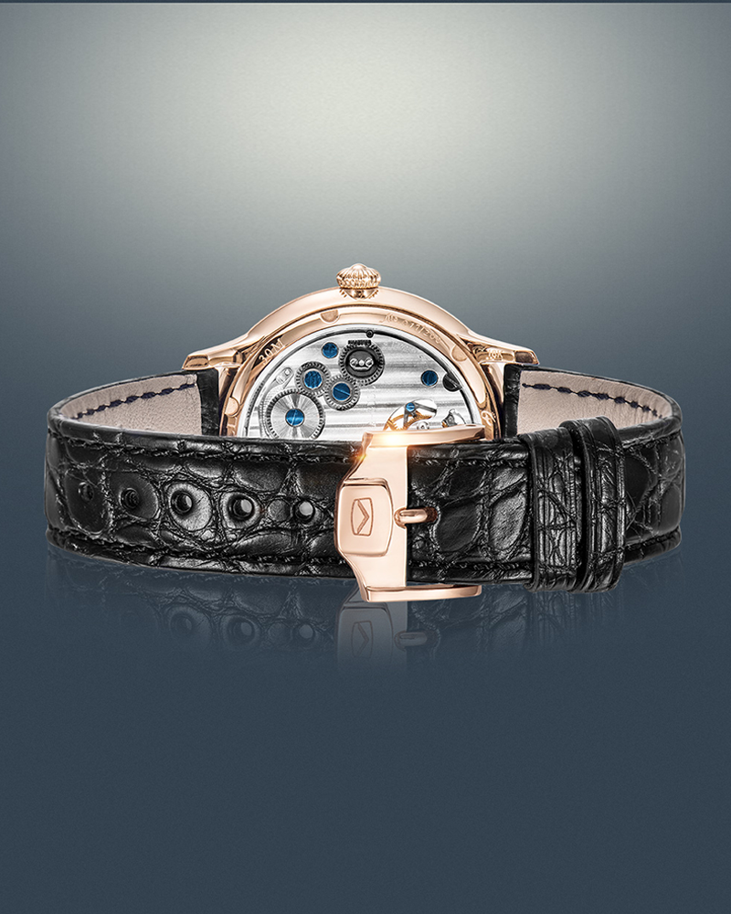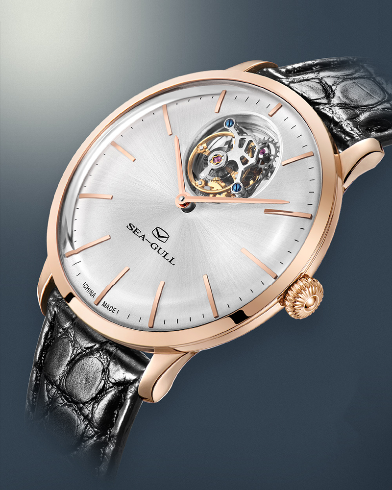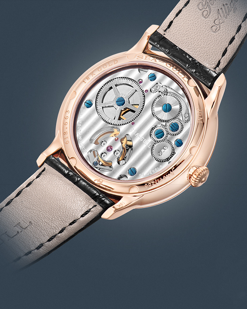 À la fois sobre et robuste, cette montre dégage une allure vintage. Le bracelet au design complexe suit une méthodologie ingénieuse, alors que le boîtier et les attaches arrondies, les index facettés et la couronne semblent raconter une légende, consolidant une grandeur audacieuse et une grâce délicate. Alimenté par le calibre tourbillon excentrique à remontage automatique ST8030 exclusif de Seagull, le tourbillon breveté « à poids réglable » atteint l'isochronisme grâce à un spiral sans entrave. Avec une glace saphir bombée, un guichet à 12 heures mettant en valeur l'envoûtant tourbillon et un fond ouvert révélant de fines platines et ponts finis à la main, cette toile mécanique envisage le temps comme une forme d'art à apprécier. Une créativité et une sophistication sans limites s'unissent dans des dimensions miniatures, rendant hommage à l'héritage culturel de l'horlogerie chinoise. Alors que chaque instant se dissout dans le suivant, cet héritage contemporain nous rappelle de chérir la poésie gravée dans chaque seconde.