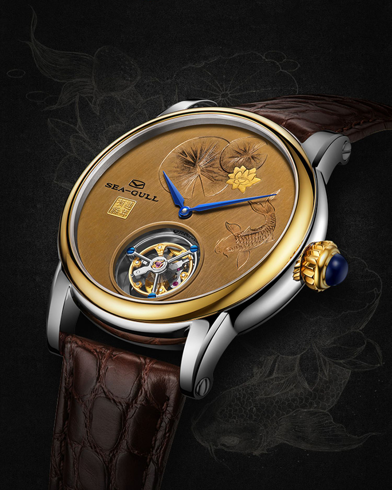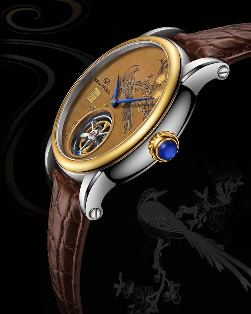 Le tourbillon coaxial du mouvement Seagull ST8230 - conçu à la perfection, dévoilant le talent artistique inhérent à l'ingéniosité mécanique. Le cadran gravé en cuivre ciselé, méticuleusement sculpté et doré, évoque avec vivacité l'esprit de la culture chinoise : un paysage pittoresque se matérialise sur votre poignet. Gravure sur cuivre : un processus complexe de fusion, de forgeage, de sculpture, de dorure, de polissage et d'émaillage. L'évolution légendaire de la gravure sur cuivre reflète le développement de la splendide civilisation chinoise. Incrustation de fils dorés : Une technique ornée incorporant des fils d'or ou d'argent dans des motifs décoratifs. En tant que patrimoine immatériel de la Chine, l'incrustation de fils dorés nécessite une sculpture complexe et une énorme patience. De nos jours, les maîtres de ce métier rare diminuent. En alliant artisanat traditionnel et ingénierie moderne, cette montre célèbre nos racines culturelles tout en ouvrant l'avenir. Puisse son héritage résonner pour les générations à venir.
