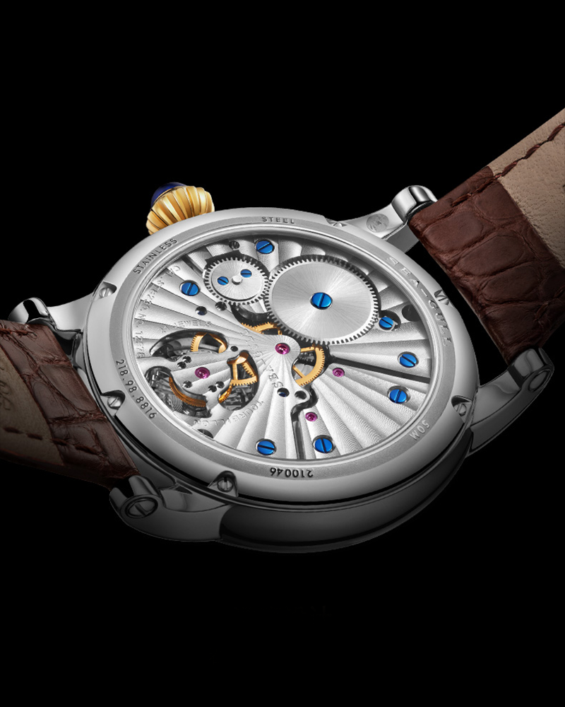 Mouvement mécanique à remontage manuel battant à 21600 alternances par heure, avec une réserve de marche jusqu'à 55 heures.