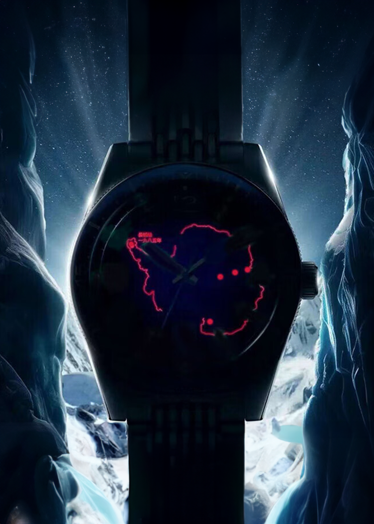 Sous la mystérieuse lumière violette, des détails cachés révèlent les contours du continent Antarctique et l'emplacement des cinq stations de recherche chinoises en Antarctique, mettant subtilement en valeur la gloire de l'exploration d'une nation à votre poignet.