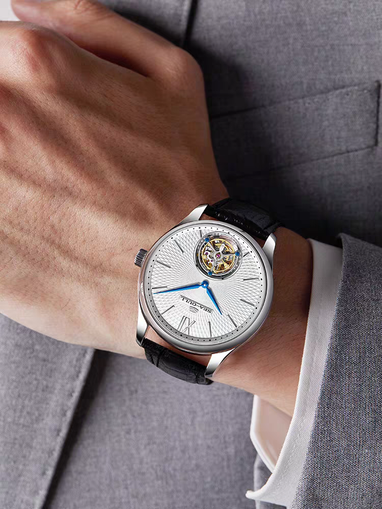 Avec des motifs guillochés soleil ornant son cadran, le Seagull Tourbillon capture la beauté du mouvement naturel. Chaque ligne ondulée ou imbriquée est méticuleusement gravée, reflétant la lumière dans des motifs fascinants. Au fur et à mesure que la montre bouge, son design crée un jeu dynamique de rayonnement, garantissant que chaque instant devient une expérience lumineuse.