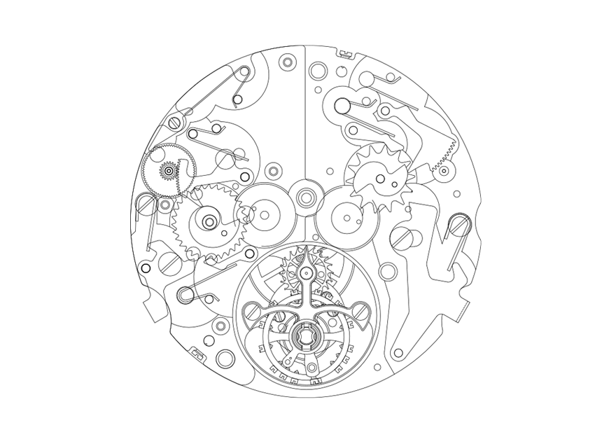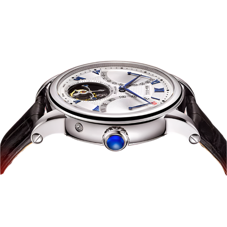 Tourbillon, phase de lune, indication de réserve de marche, étanche à 50m.