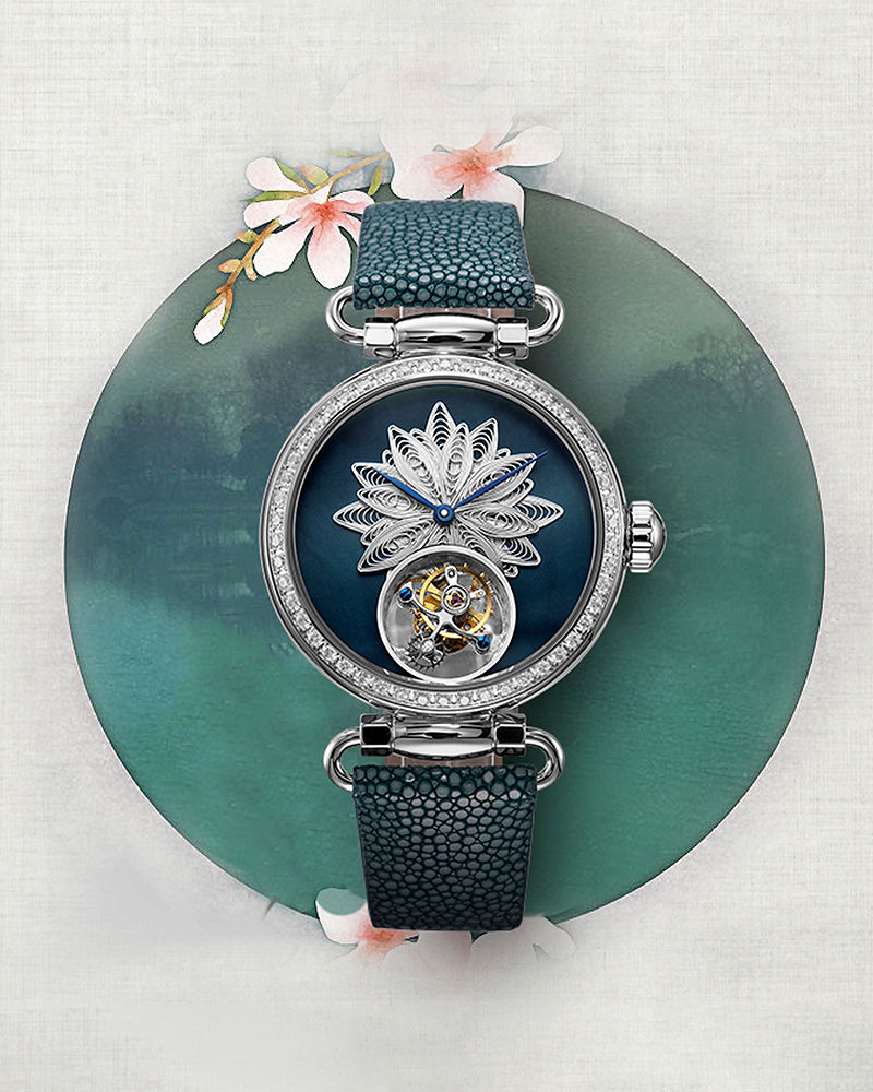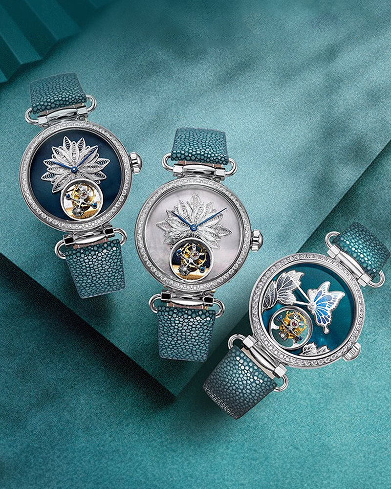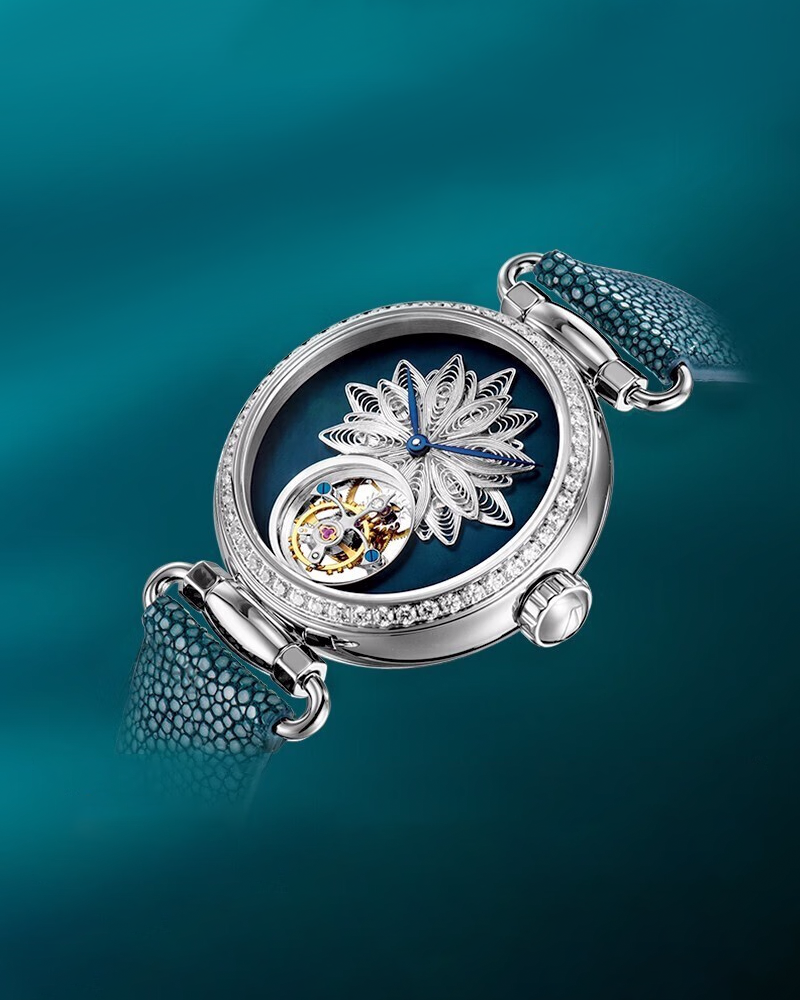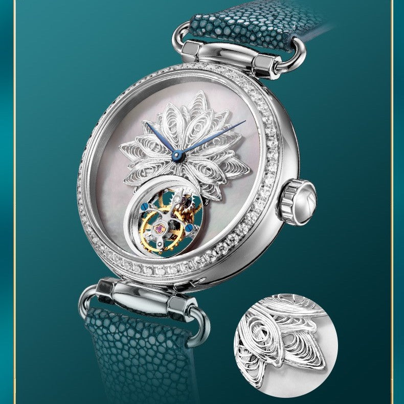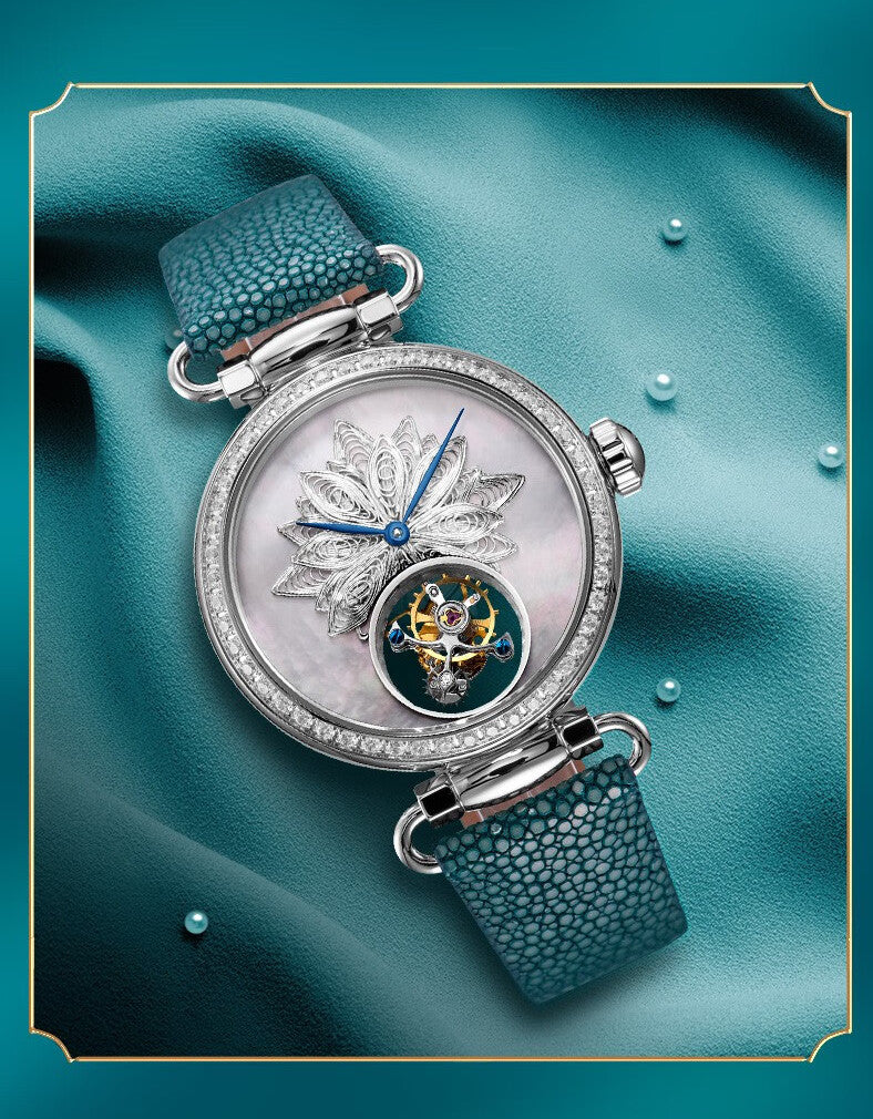 マザーオブパールの文字盤は光沢があり、まばゆいばかりで、東洋の魅力を備えた独特の美しさを披露し、3つの伝統的な色から選択できます。真珠模様の悪魔の魚皮のストラップは、表面に埋め込まれた真珠に似た鮮やかな光沢で飾られ、幸運をもたらすと信じられている独特の質感が特徴です。透明な裏蓋のデザインにより精密機械のリズムを垣間見ることができ、ジュネーブストライプが絶妙な美しさを表現します。