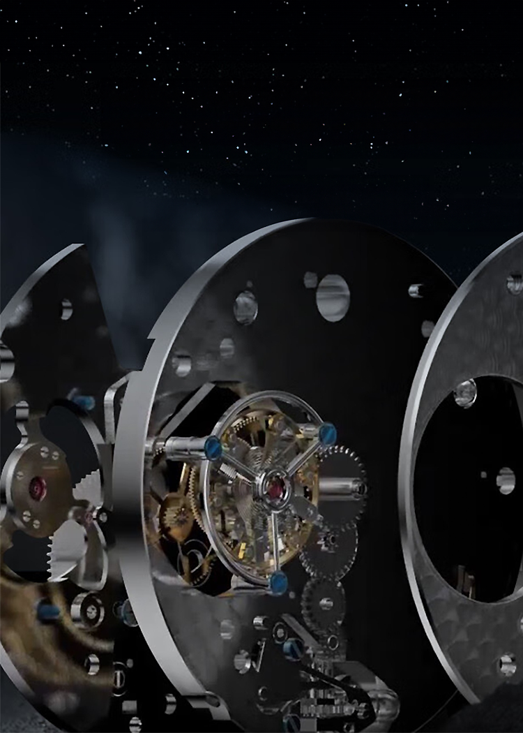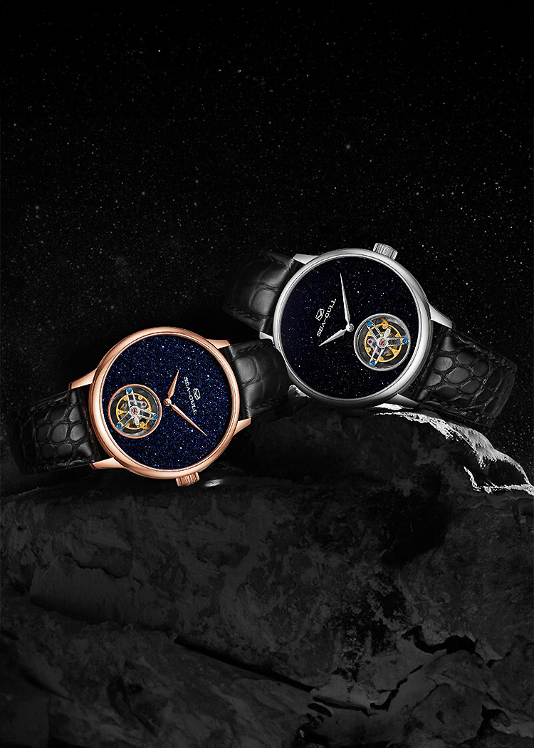 ゴールドストーンをあしらった深みのあるブルーの星空文字盤は、神秘的に輝きながらも、果てしない夜に散らばる無数の星のように鮮やかに輝きます。星空は時間とともに溶け合い、この不思議な宇宙の一端を時計に結晶化しているかのようです。