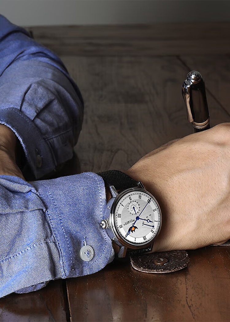 ムーンフェイズ、パワーリザーブ表示、50m防水。