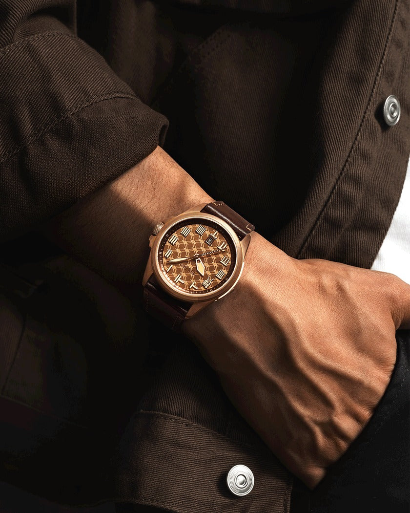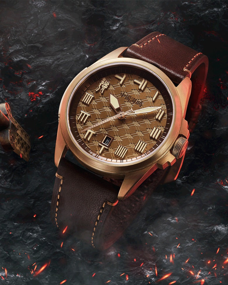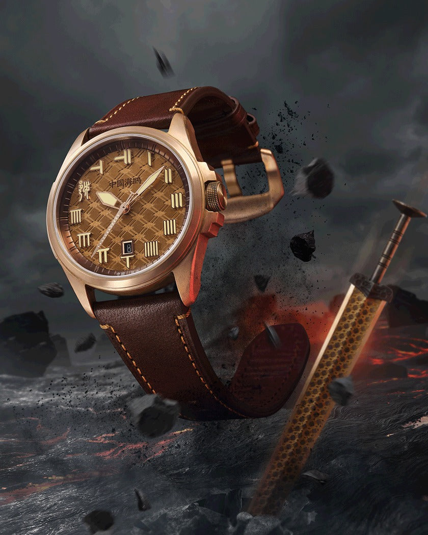 世界一の剣と称えられる「越の王狗堅剣」からデザインのインスピレーションを得て、中国の軍事文化の要素と精神を融合しました。文字盤はヴィンテージのブロンズグラデーションカラーと規則的なダイヤモンドパターンを採用し、春秋時代の刀の鋳造の独特なスタイルを復元しています。3Dスタッドマーカーは、春秋戦国時代の縦棒計算機に由来し、大胆で実体があり、文字盤にそびえ立っています。秒針の形状は、鋭く冷たく、生き生きとした王狗堅剣の形状を洗練しています。