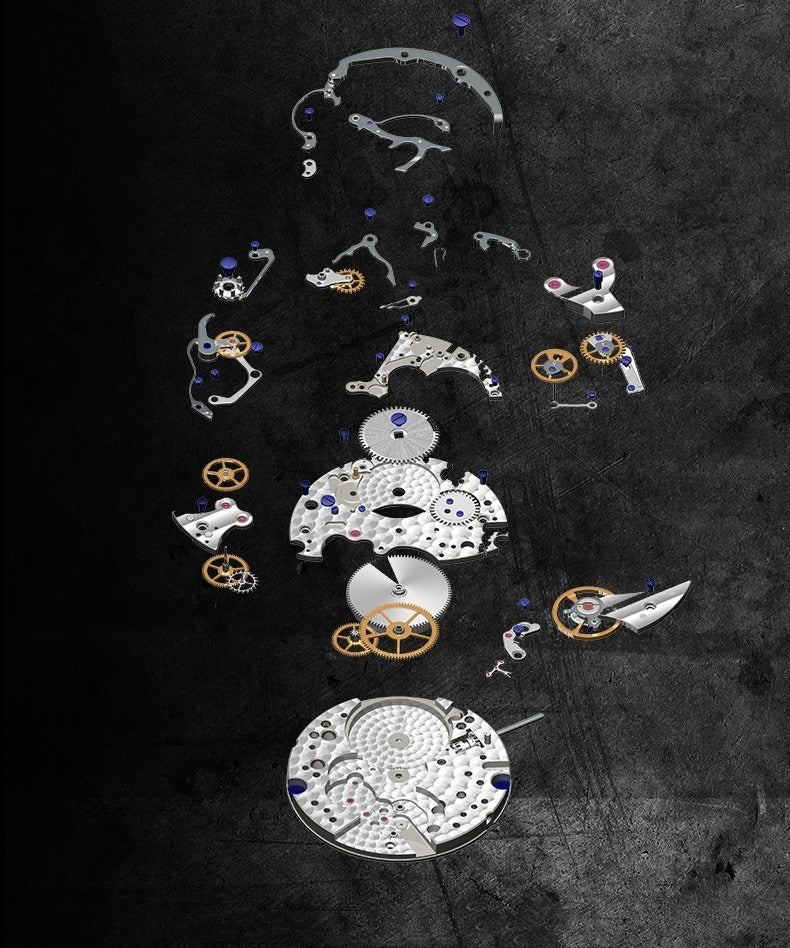 The tachymeter scale on the outer edge of the dial resembles an aircraft instrument panel, exhibiting an extraordinary sense of speed. The chronograph buttons have a radiating texture design, tough and retro, exceptionally stylish. The transparent caseback vividly reveals movements in motion, appreciating intricate mechanical art.