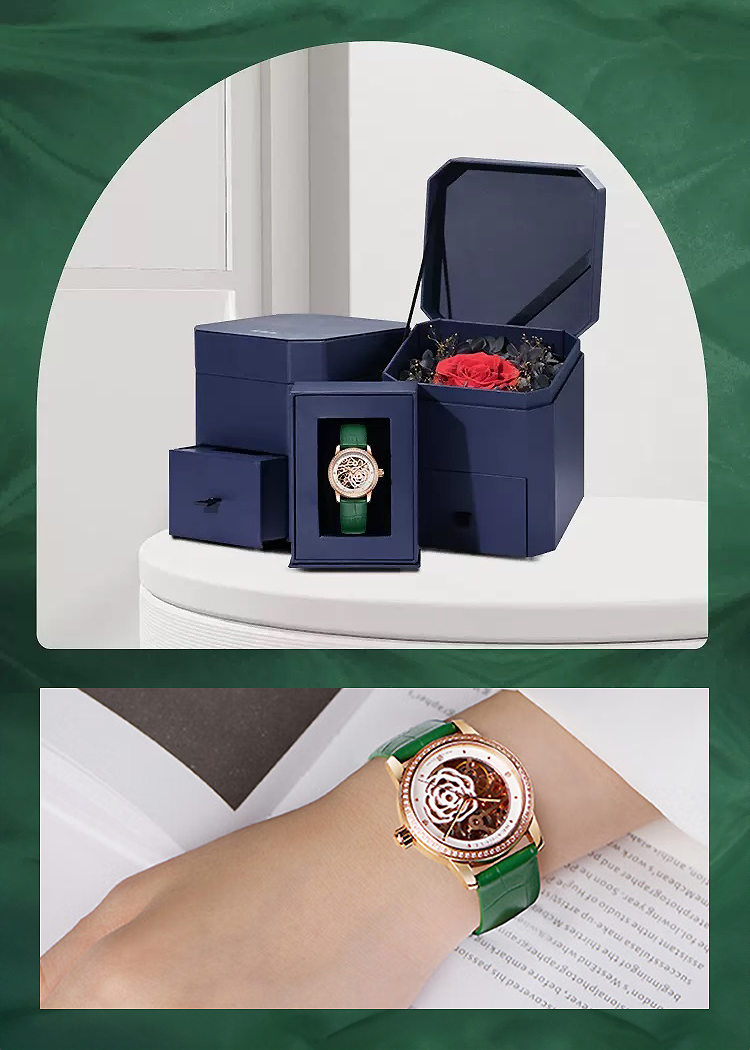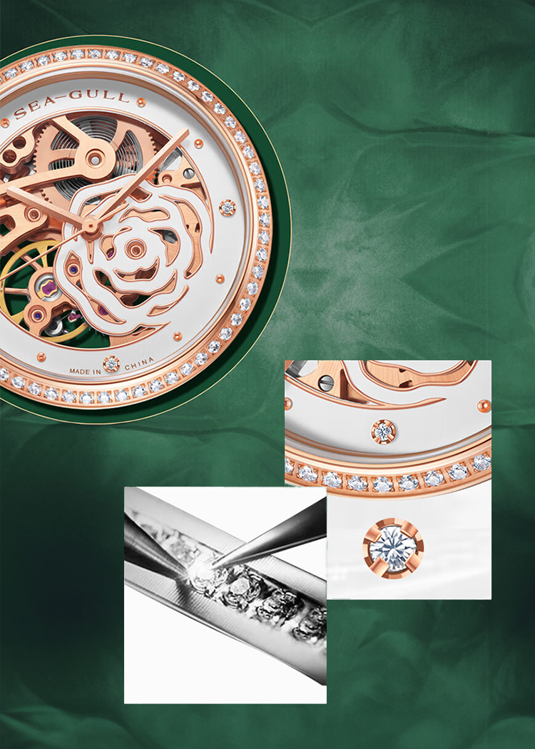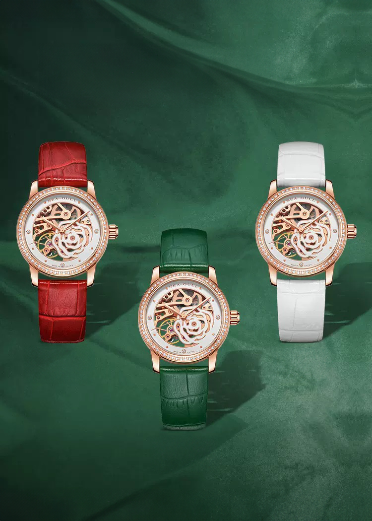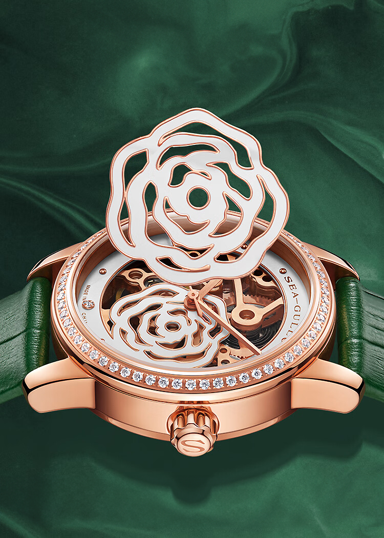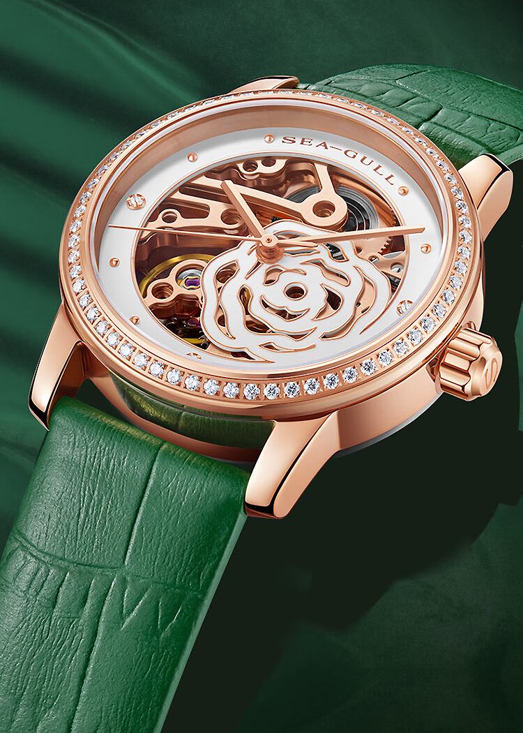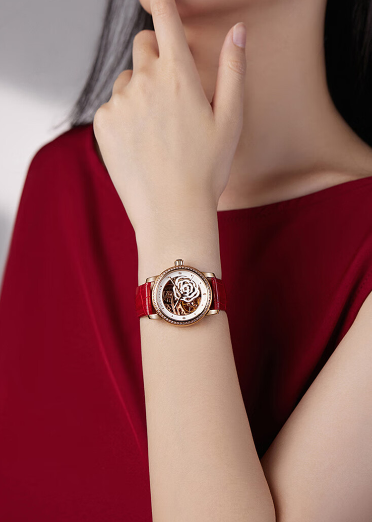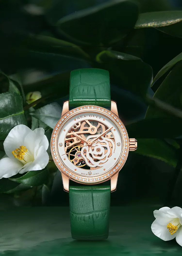 The hollowed dial design, a balance of strength and softness, symbolizing the resilience and non-compromise of women, brave, confident, and blooming freely like camellias. The rose gold case, like the first rays of morning sunlight, full of vitality. The sparkling and translucent zirconia, like dewdrops condensed from mist, shining brightly. Beneath the romantic and graceful lace-like dial lies a resilient and independent mechanical movement. The delicate cowhide strap, paired with bamboo-like textures, complements the slender wrists.