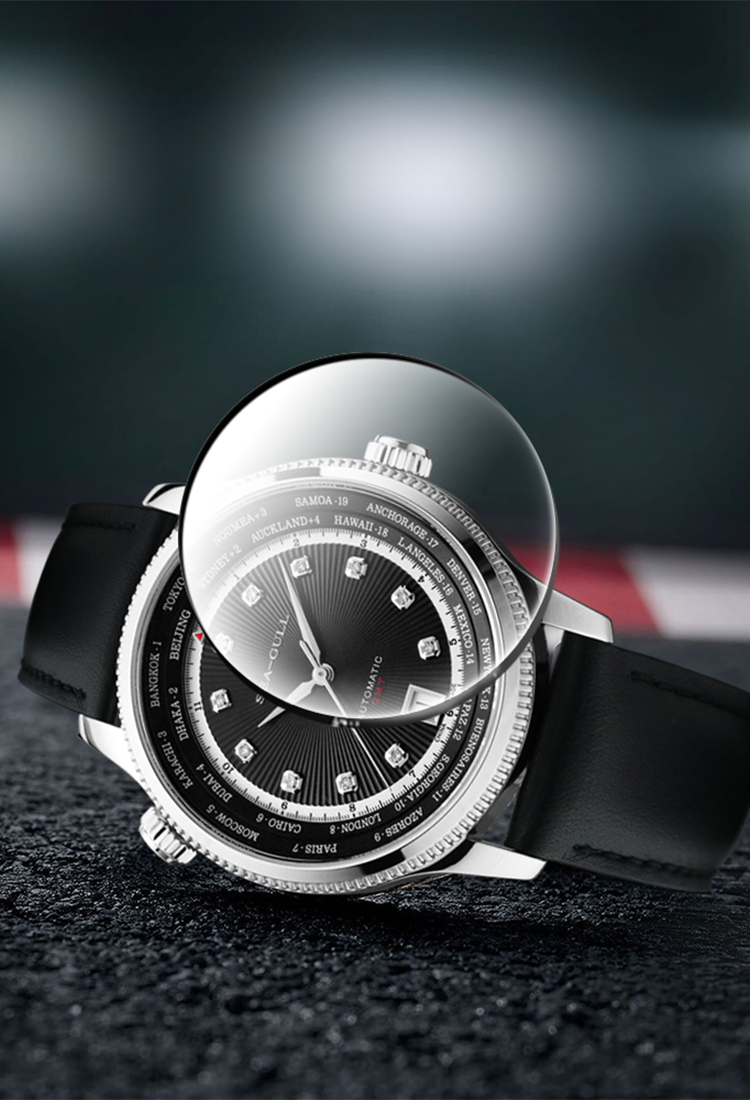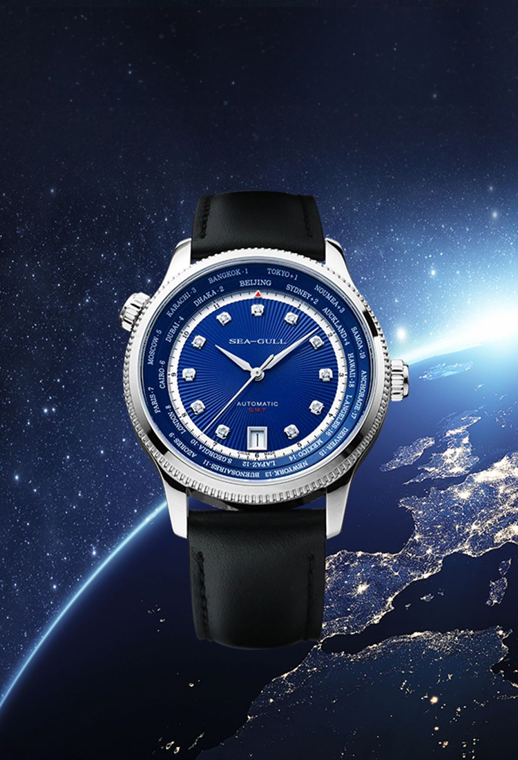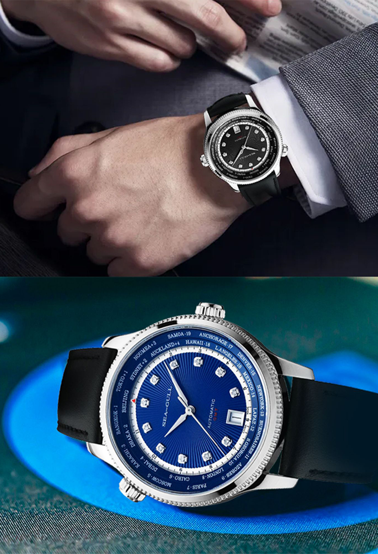 The exquisite design and subtle elegance of this timepiece, reminiscent of a captivating wrist masterpiece, create a profound aesthetic impact that captivates enthusiasts as a cherished collectible. It showcases 24 time zones and the current time difference through the time zone ring and city ring. The dial is adorned with 11 genuine diamonds as hour markers, radiating brilliance, complemented by a calendar display at 6 o'clock.
