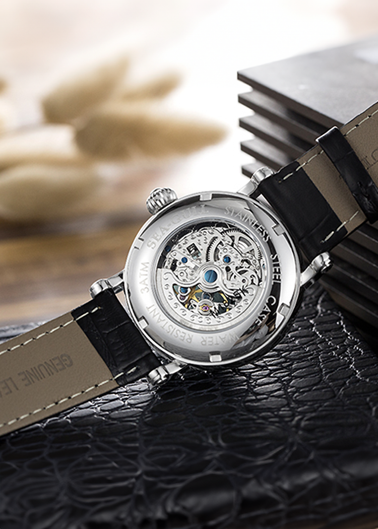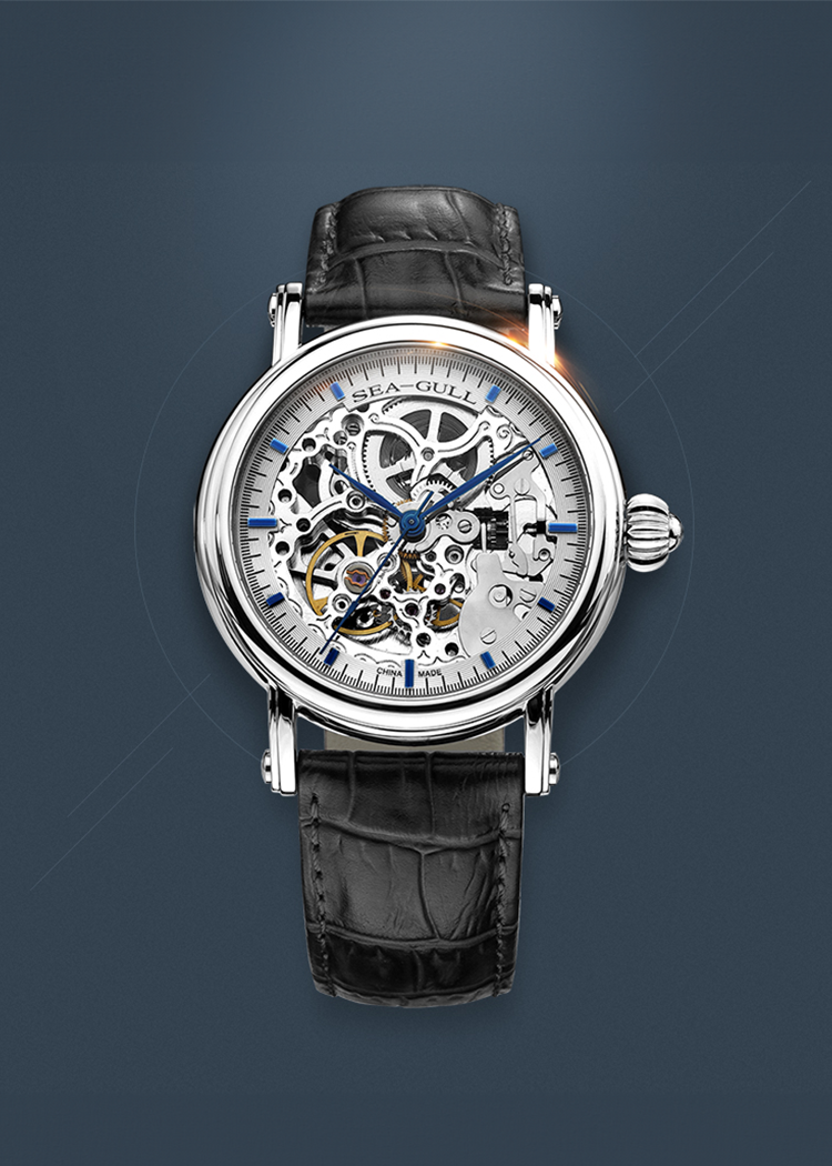 Introducing the Seagull Double Skeleton Automatic Watch 38mm—a captivating blend of mechanical mastery and aesthetic elegance. At its heart lies a meticulously crafted automatic movement, visible through the intricate double skeleton design of the dial and case back. The mesmerizing interplay of gears, springs, and balance wheel is showcased in exquisite detail, offering a fascinating glimpse into the inner workings of the watch.