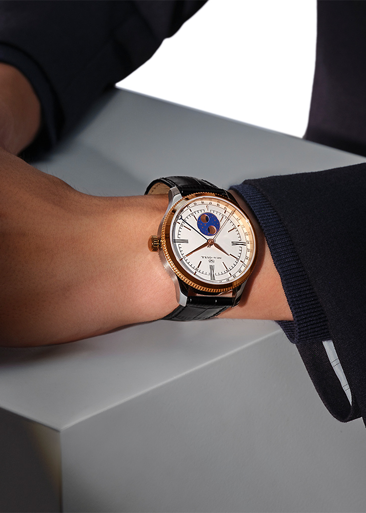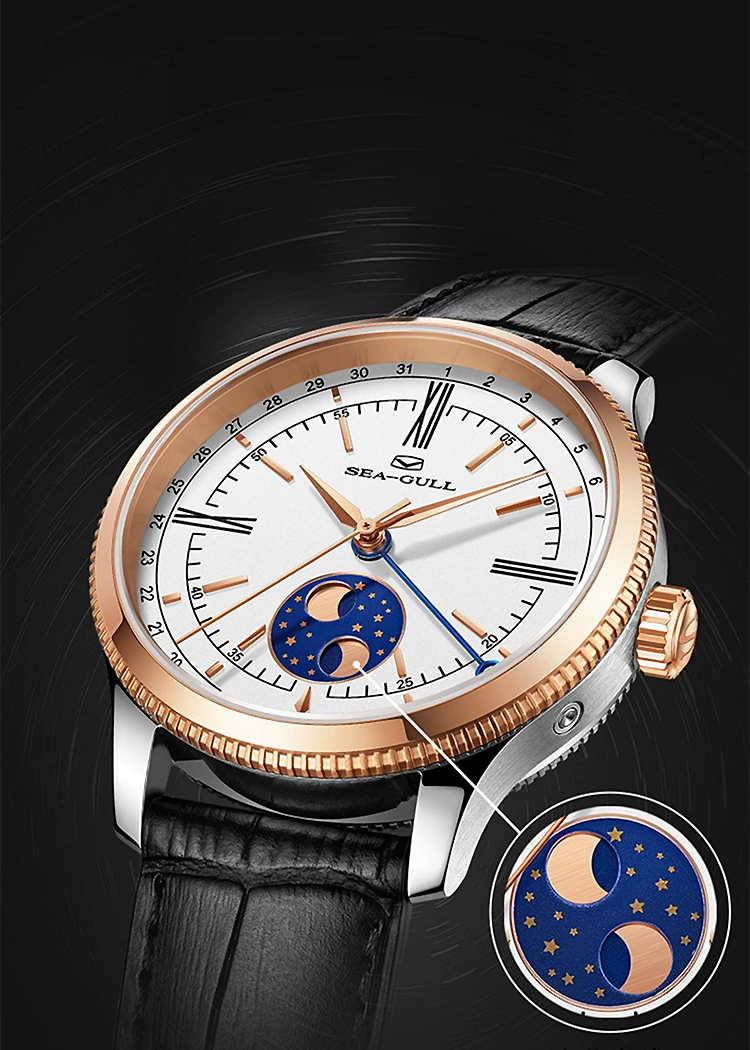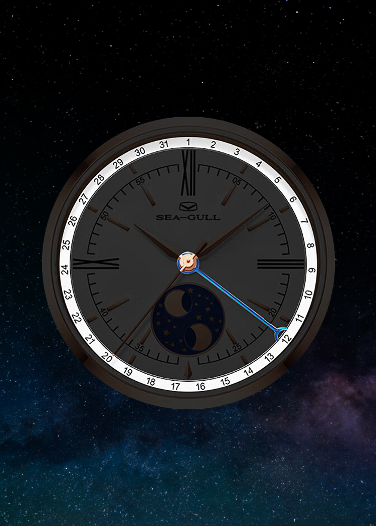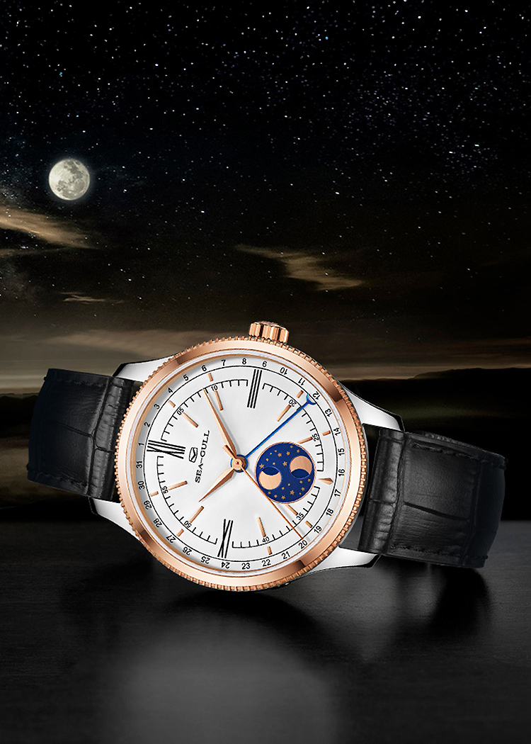 The multifunction dial efficiently manages time. The clever calendar bezel design clearly indicates the date with deep blue hands. Moonphases for northern and southern hemispheres display waxing and waning. The moon phase cycles every 29.5 days. By calculating the periodicity, the waxing and waning moon patterns emerge for appreciating its beauty on the dial.