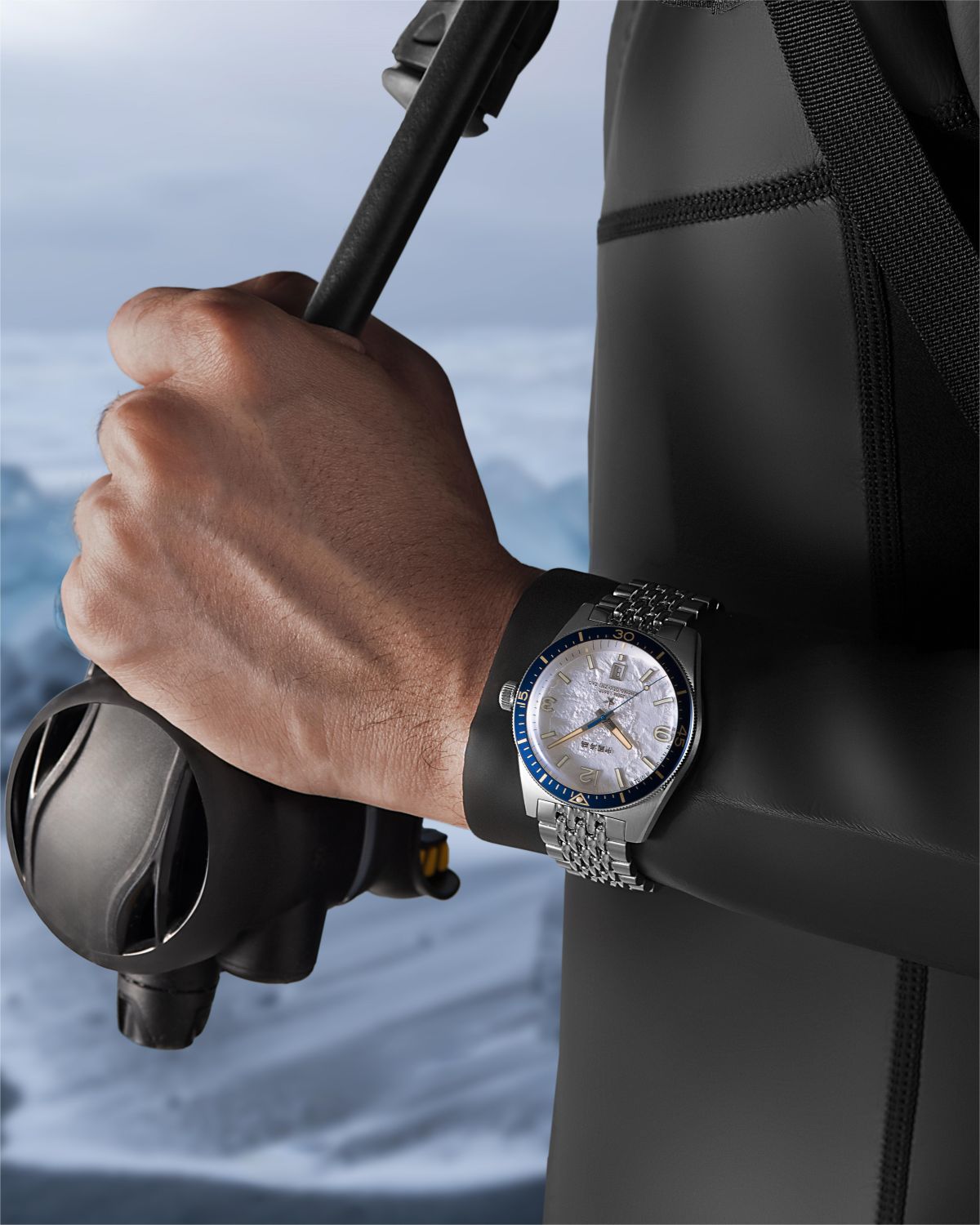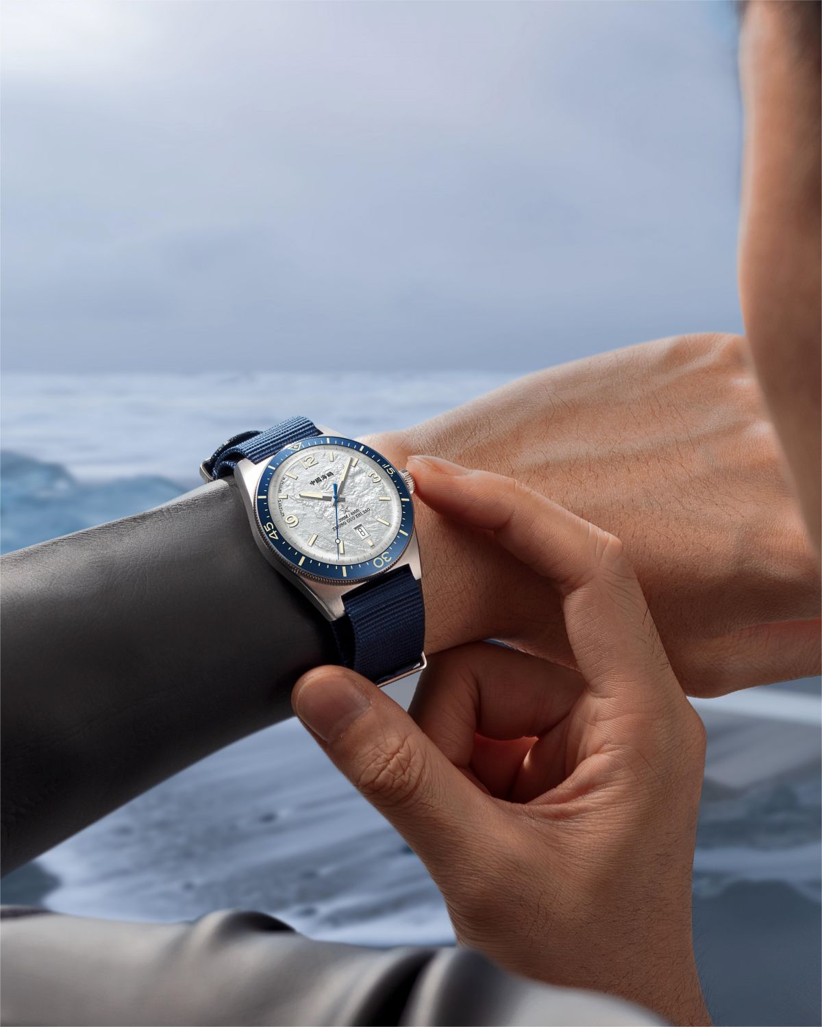Crafted with precision and a nod to the past, this special edition features an intricate 3D Antarctic relief, a sapphire bubble crystal, and straight lugs reminiscent of the original design. Under ultraviolet light, hidden details on the dial reveal the outline of the Antarctic continent, the locations of China's five research stations, and the coordinates of Great Wall Station at the 10 o'clock position.