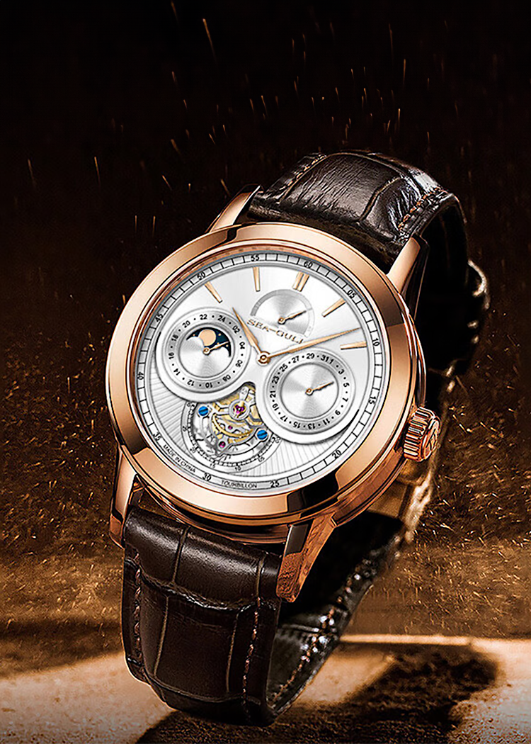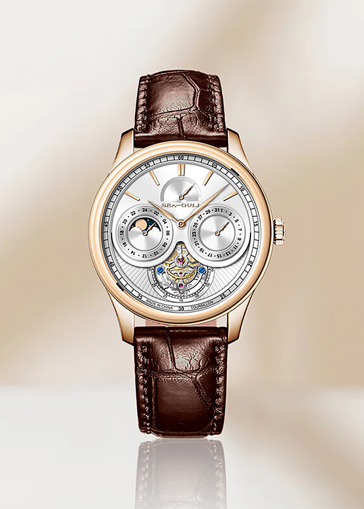 Drawing inspiration from the seagull unfurling its wings, the classic circular dial features a two-layer division. With an off-center tourbillon as delicate as a cicada's wing, the exposed oscillating clip reminiscent of a "flying swallow", this timepiece fuses stellar performance and mechanical artistry. The multifunction dial constantly affirms its value - potential energy, calendar and 24-hour time. Through the transparent caseback, the mechanical movement is in unobstructed view. The alligator strap is supple and comfortable, with an excellent sheen.