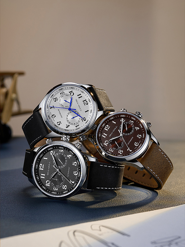 The multifunctional dial follows the golden ratio for centered symmetry, with clearly defined zones making time easy to grasp. Paris stud textures exudes gentlemanly elegance. Dual time settings let you freely keep track of two time zones. Crafted from 316L stainless steel with wire drawing process for enhanced texture. Artificial sapphire crystal, highly transparent and durable, persisting beautifully over time. Anti-reflective coating applied for optimal clarity. Energy-storing luminescence grows brighter into the night, enabling easy time reading even in darkness.