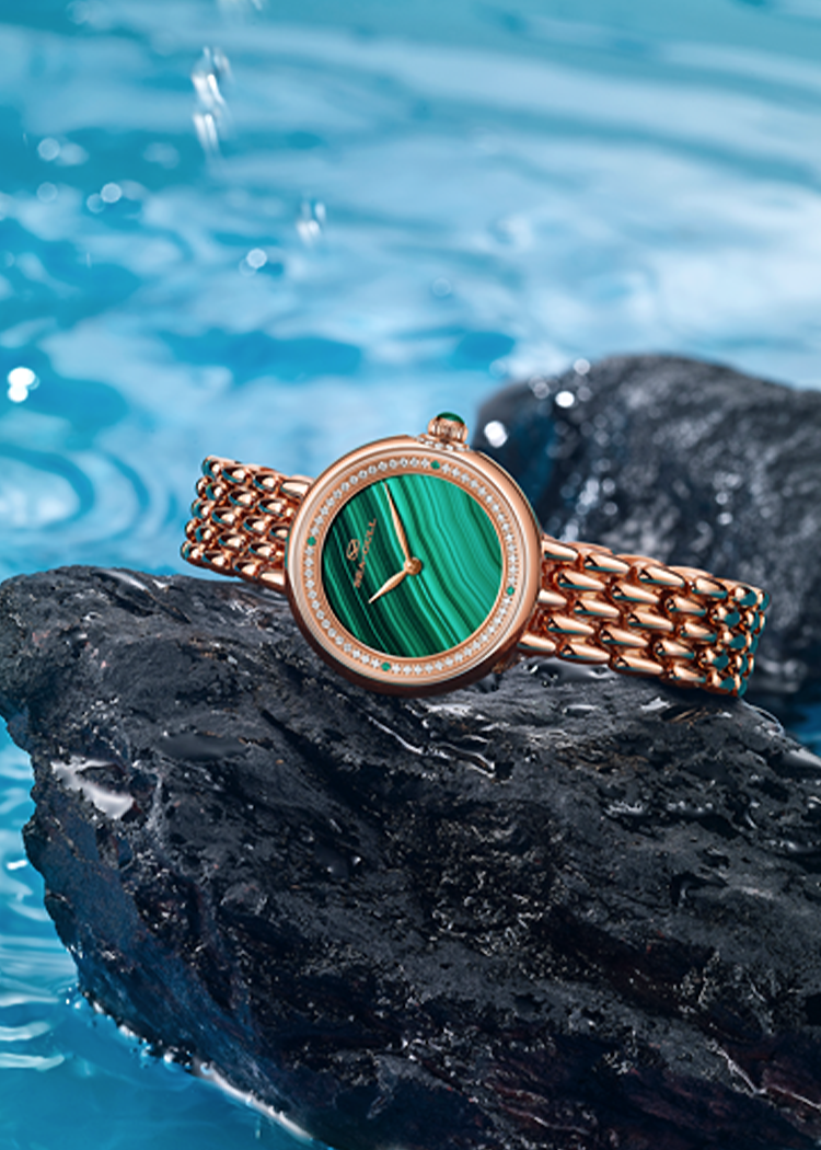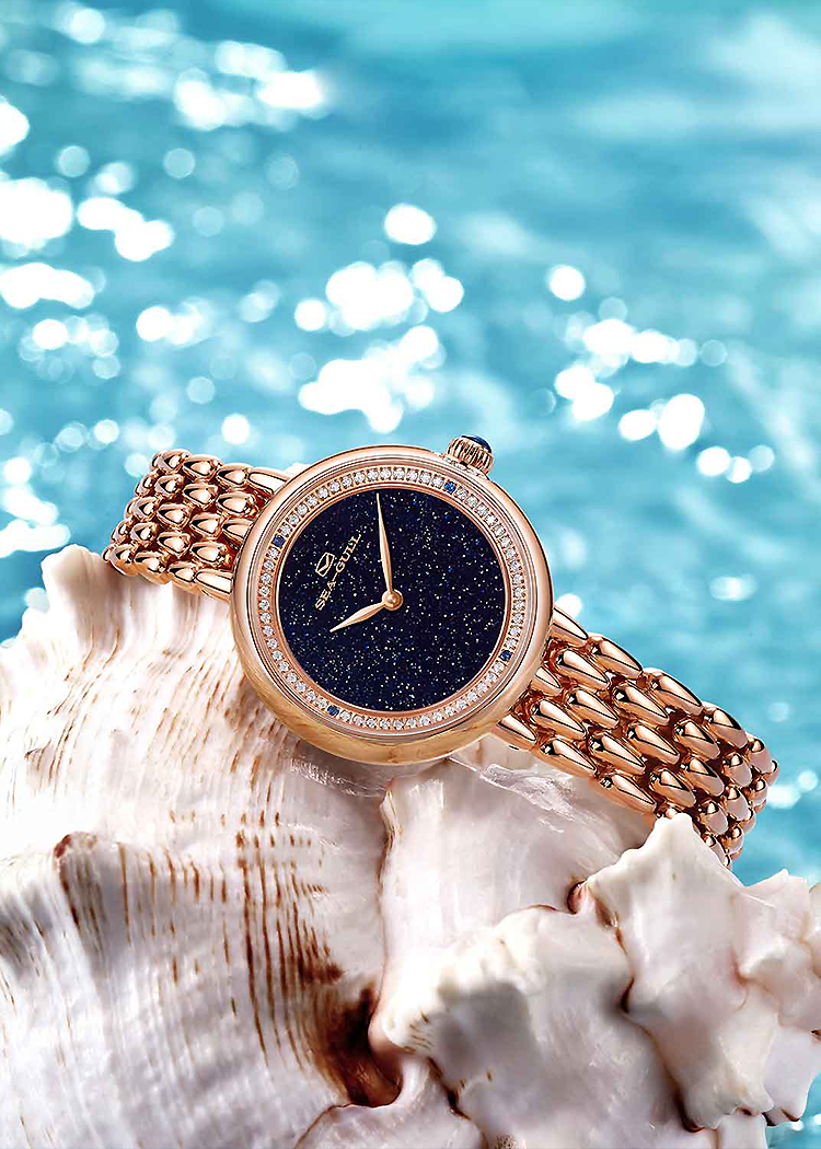 With ever-shifting nacre dial resembling the northern lights, a prismatic halo materializes under the sun's rays. As if rainbows graced the wrist.