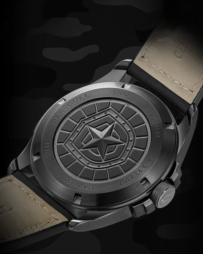 The military theme is exploration and tribute to modern military scenes and memorial events, showcasing the enduring Chinese spirit through time. It is the classic military style watch. The 316L corrosion-resistant stainless steel case features engraved markings on the side. The 3D raised lume scales are designed like a battlefield sand table. The double-edged sword hands and starry Xuanwu shield dial exude strength and solidity, sturdy as a rock. 100M water resistance reaches diving standards with a sealed case structure and screw-down crown, suitable for harsh environments.