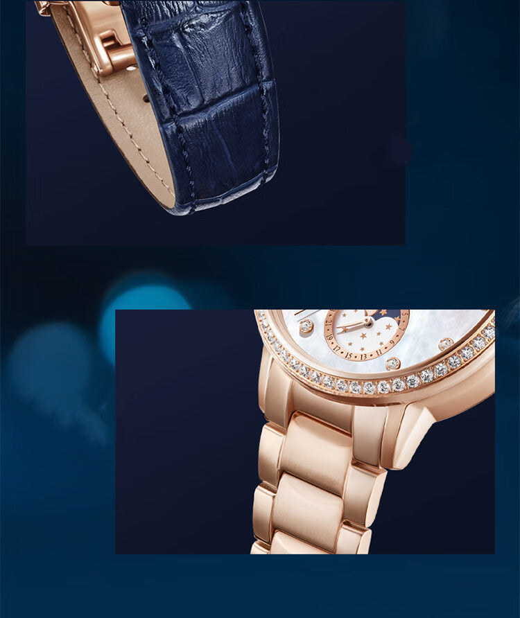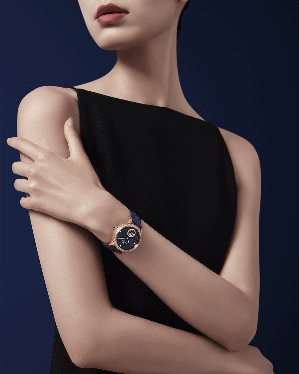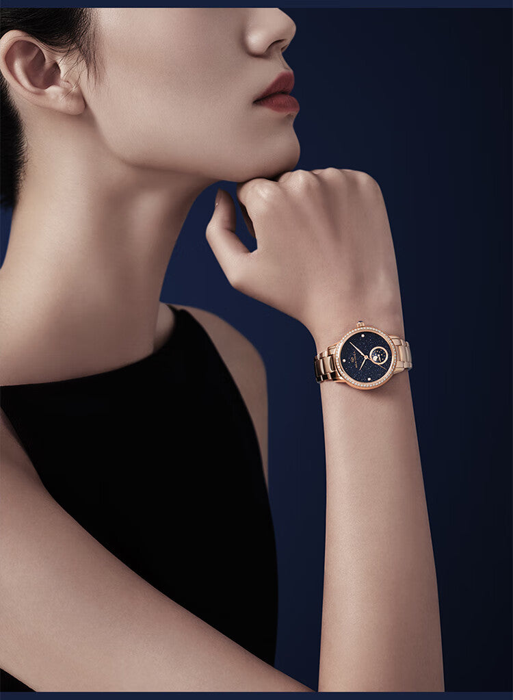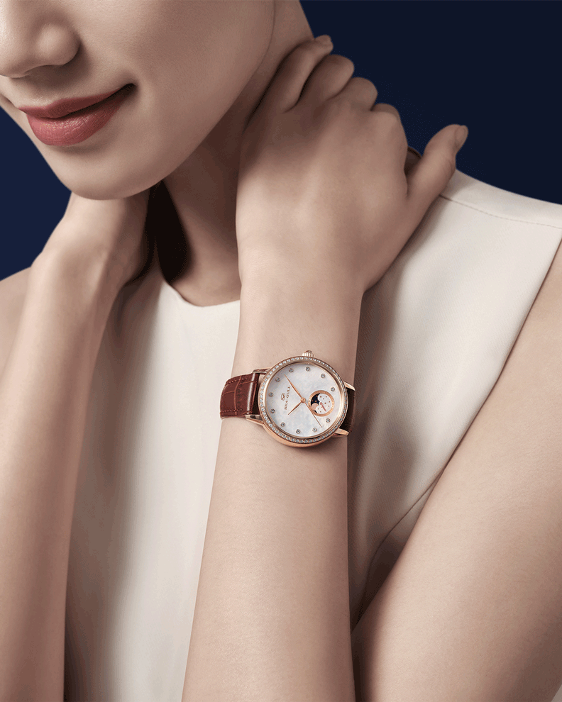 With a semi-realistic moonphase display dynamically reflecting the lunar cycles, it celebrates a woman's immense yet hidden strength, like the moon's ever-changing light.