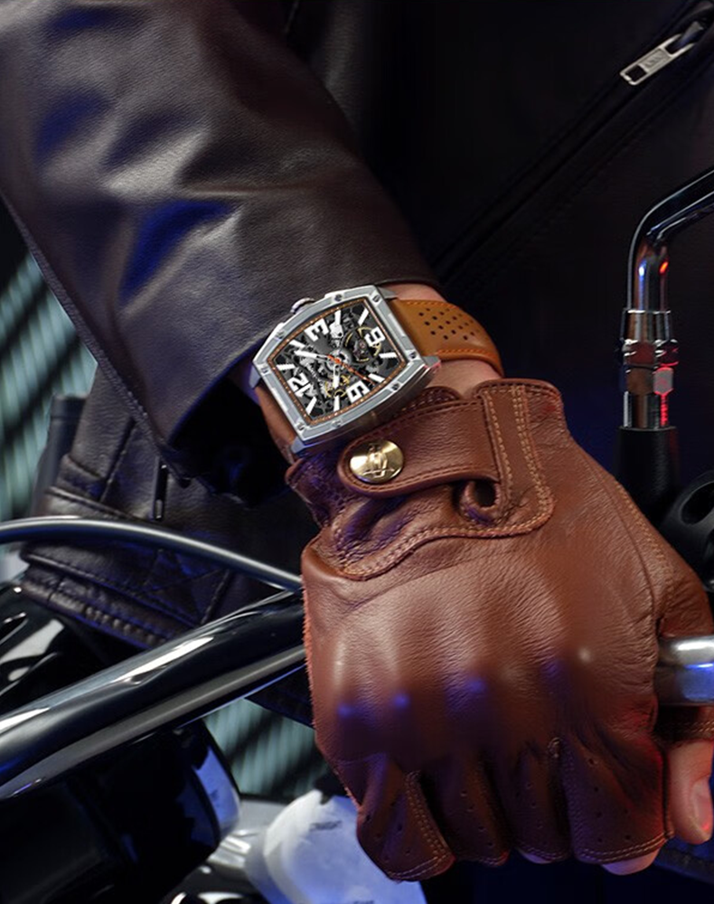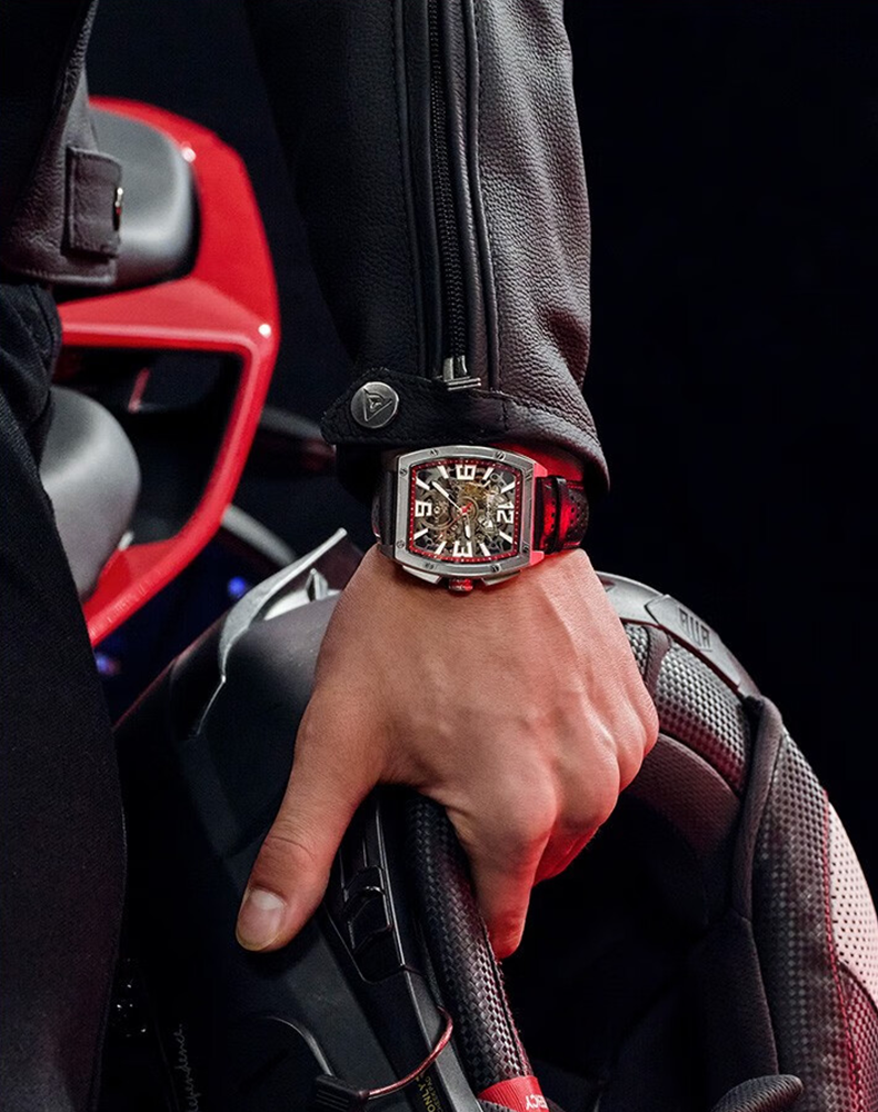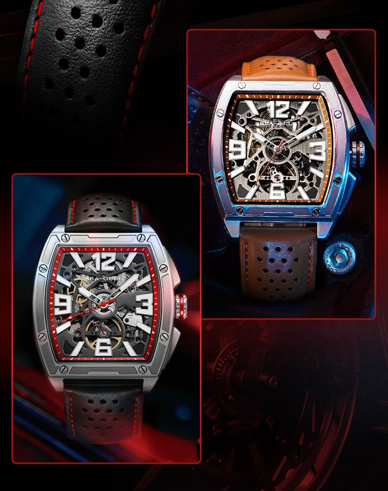 Adopting a barrel shape, double transparent sides and an entirely hollowed-out dial, the fully revealed vision accentuates its sharp styling. Equipped with a ST25 movement, 21,600 vph frequency for more accurate timekeeping, and an impressive 42-hour power reserve to meet the needs of impassioned speed. With a synthetic sapphire crystal, it is abrasion and scratch-resistant for clear readability. The cowhide watch strap is soft and comfortable, epitomizing quality.