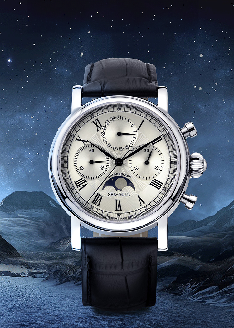 月相每 29.5 天循環一次。透過計算週期,盈虧月亮圖案就會在錶盤上顯現出來,供欣賞。合成藍寶石水晶防眩光、超耐磨,莫氏硬度高達9級。透明底蓋充分展現ST1908機芯的機械美感。