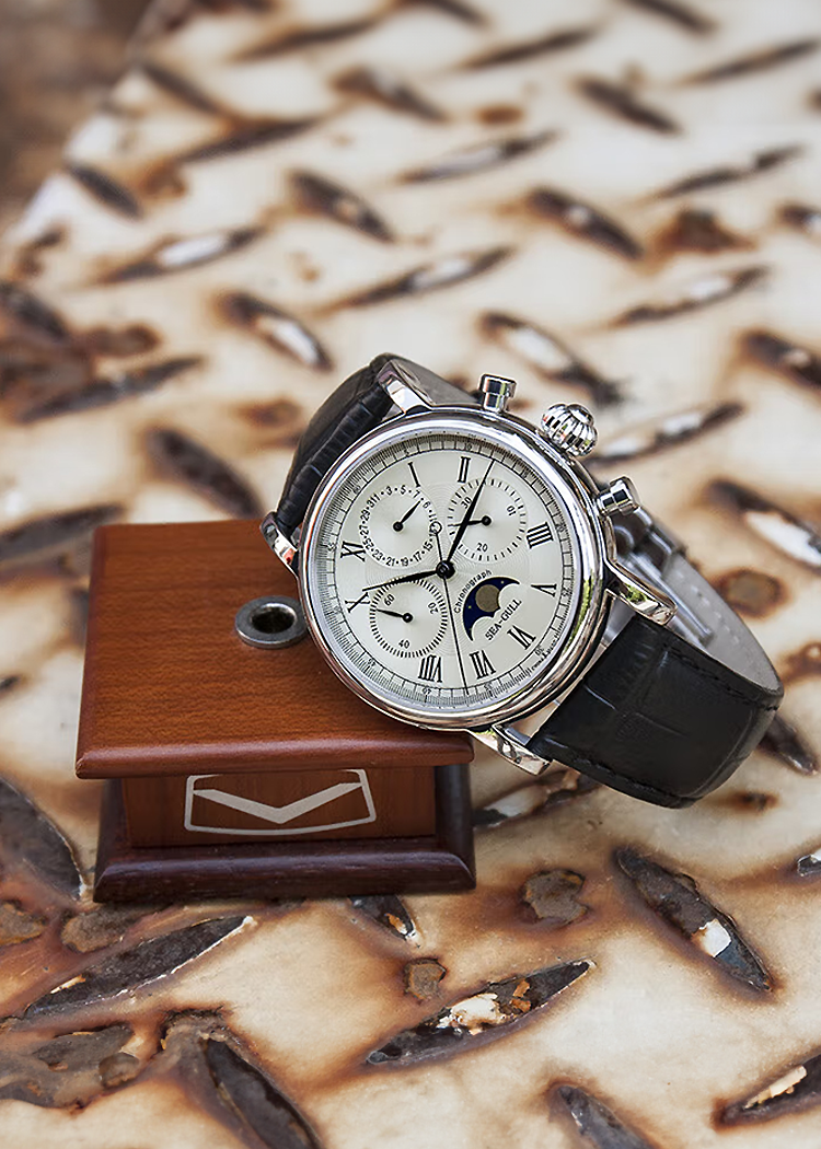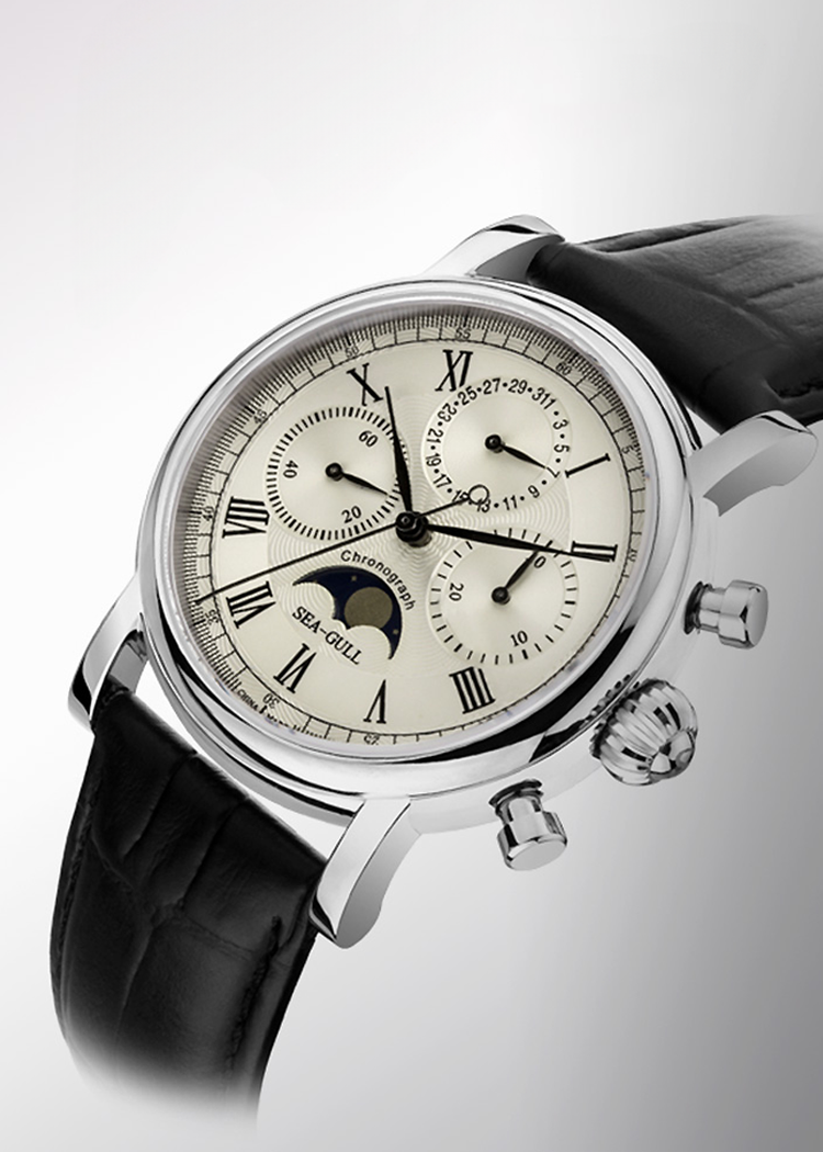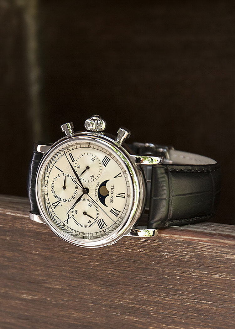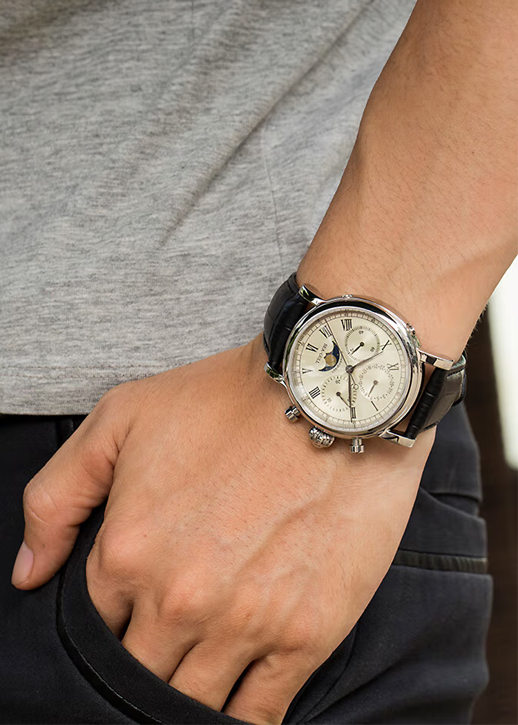錶盤設計整潔、清晰,佈局平衡。如果說陀飛輪腕錶讓人驚嘆不已的藝術品,那麼計時碼錶無疑是手中實用的計時工具。這款腕錶無論是設計、尺寸適中的錶盤或功能——日曆、30分鐘計時盤、月相——都表達了豐富感。