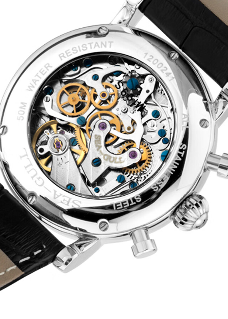 3點鐘位置設有30分鐘計時盤,9點鐘位置設有小秒針,防水深度為50m。