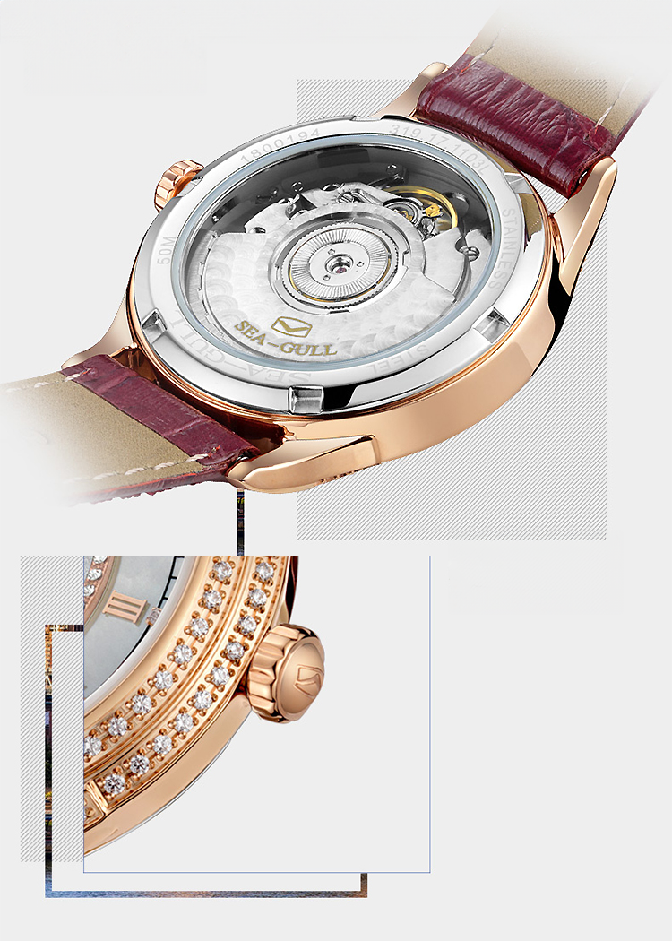 明亮的鋯石環繞錶圈,閃爍著柔和的光芒。珠寶級四爪鑲嵌工藝確保更高的耐用性,不易脫落。透過透明底蓋,機械機芯一覽無遺。 316L不鏽鋼具有強大的耐腐蝕性,拋光後光澤度更高。