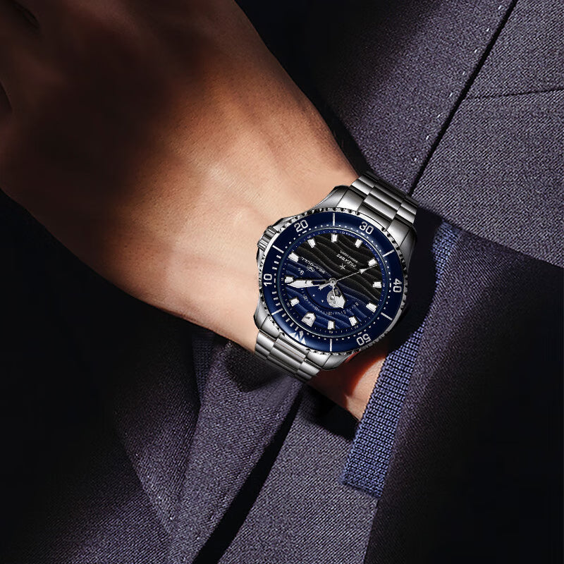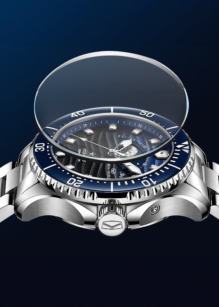 簡潔優雅的時標和指針均塗有夜光材料,即使在深達 300 公尺的深潛中也能確保精確的可讀性。這款腕錶搭載海鷗自主研發的 ST2162 機芯,在 ST2130 基礎機芯的基礎上增加了月相複雜功能,具有高防水性、耐用材質和夜光指針,是探索海洋深處的冒險家的可靠伴侶。