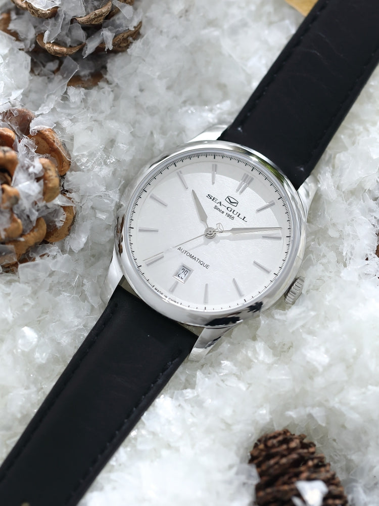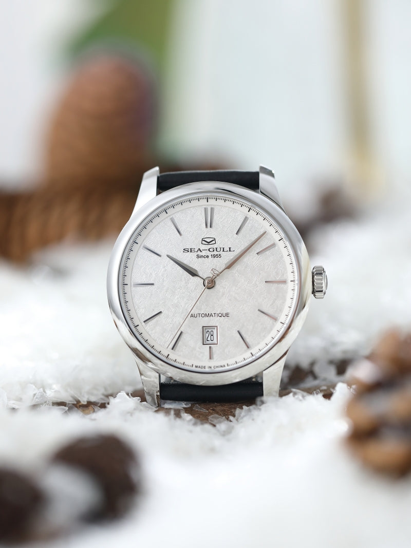 2023年推出的新款腕錶採用雪花圖案錶盤,經過複雜而精緻的製造工藝打造而成。首先,將雪花圖案壓在黃銅錶盤底板上,然後進行電鍍以模擬雪花顏色,最後塗上透明材料以防止氧化。結果是錶盤表面讓人想起雪景。黑色皮錶帶光滑柔韌,舒適貼合手腕,另附一條棕色錶帶。
