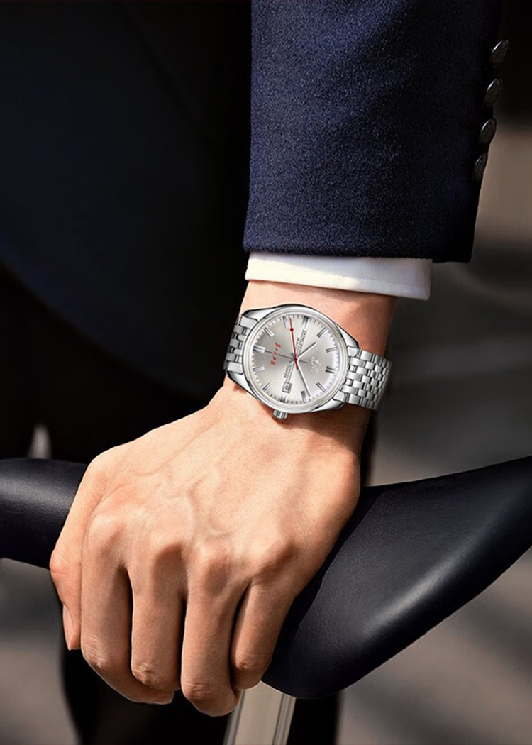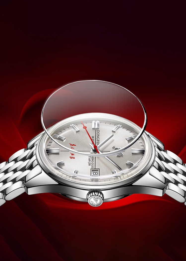 東方白復古太陽紋錶盤讓人回想起經典風格,而 6 點鐘位置的「為人民服務」座右銘則肯定了我們的價值觀。簡約的錶盤搭配標誌性指針和紅色秒針,保留了永恆的起源。圓頂藍寶石水晶在錶盤上形成一個“天穹”,當指針平穩滑動時,放大清晰度以實現最佳的可讀性。這次重新發行的作品將傳統與創新結合在一起,在致敬過去先驅者的獨創性的同時融入了現代技術。當我們回顧過去的成就時,未來充滿希望。